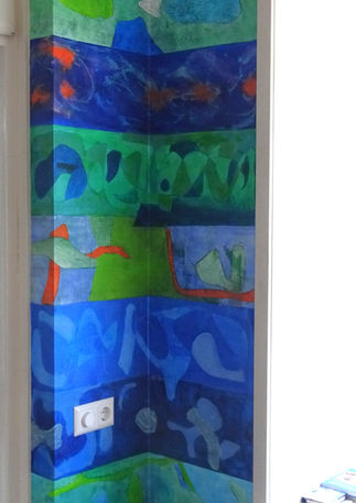 Marja maakte een schilderij in acryl en olieverf op linnen om een saaie kamerhoek te verlevendigen. De opdrachtgever had de sfeer van een eerder werk van Marja, een collage van marmers, in gedachte. En zij prefereerde een werk in de kleuren blauw en groen. Het linnen werd als behang gemonteerd op de muur.